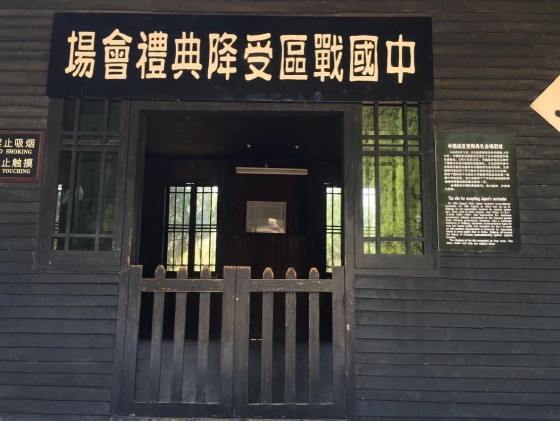 在魅力尽情展示的阳光下,我走进了“受降堂”。这是一间双层木结构的鱼鳞板平房,正面正是孙中山先生的画像和横竖条幅,条幅上是先生的遗言,后面悬挂的是中英美俄四国的国旗。堂内正面为受降代表席,对面为投降代表席。这里还有中国共产党领导的八路军代表席位,也有国内外记者席。这里风不吹,树不摇,只有知了在没完没了地叫。此时,似乎所有的声音都像鸟一样扑棱棱地远去,只有那几棵老树在幽幽地诉说着过往的风。